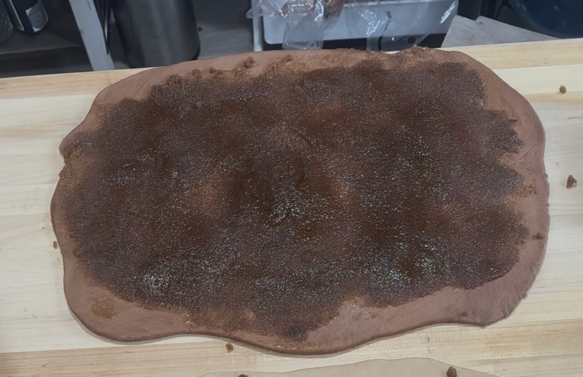 - Step 6: Spread the Filling. Spread soft melted butter with the cinnamon, brown sugar, and ginger all over the dough rectangle, leaving a small, clean edge on one side.
